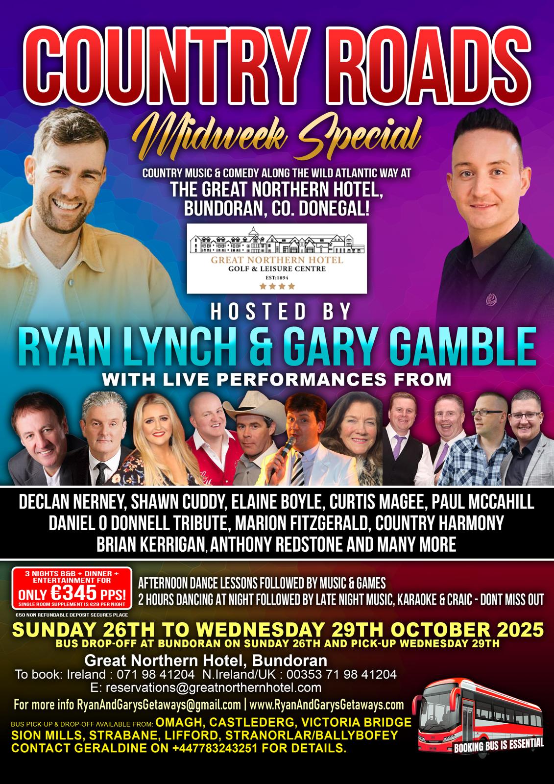 From Sunday, October 26th to Wednesday, October 29th, 2025, immerse yourself in country music and comedy at the Great Northern Hotel in Bundoran, County Donegal. Hosted by the lively duo Ryan Lynch and Gary Gamble, this event promises fun, laughter, and live entertainment along Ireland’s scenic Wild Atlantic Way.
